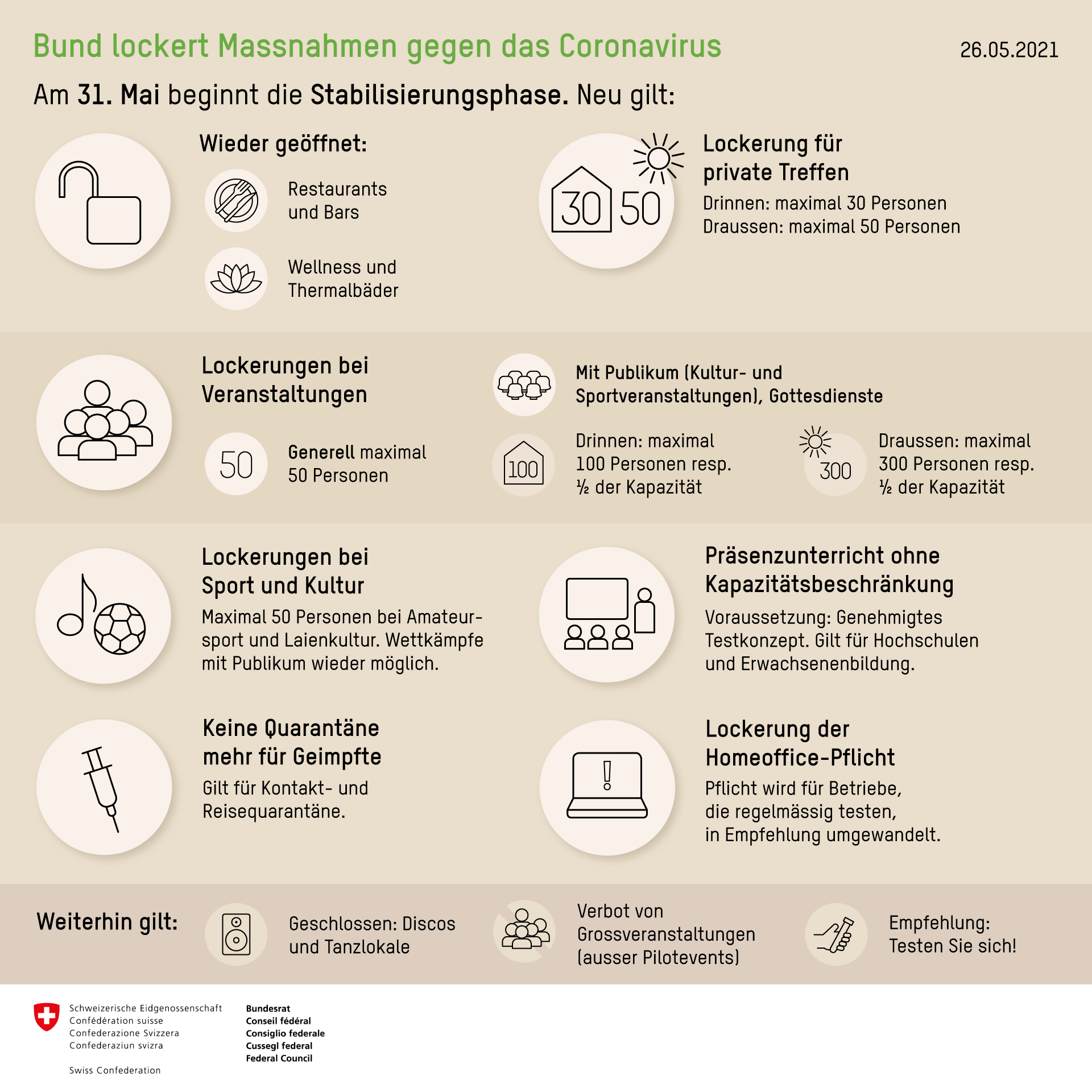 Nach wie vor gelten strenge Regeln zur Eindämmung der Corona-Pandemie. Wegen des Anstiegs der Fallzahlen, konnte der Bundesrat an seiner Sitzung vom 19. März 2021 keine wesentlichen Lockerungen der Massnahmen beschliessen. Die beiliegende Übersicht zeigt, welche Regeln und Verbote zurzeit national gelten. In den Kantonen kann es zudem strengere Massnahmen geben. Die Durchführung von Veranstaltungen ist weiterhin nicht erlaubt, Menschenansammlungen draussen bleiben auf 15 Personen beschränkt. Demzufolge können auch nach wie vor keine öffentlichen Beständeschauen stattfinden – die Exterieurbeurteilungen sind in Form von Hofbeurteilungen durchzuführen.